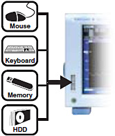The AQ6376E has USB ports that are compatible with a USB storage device, mouse, and keyboard. The file feature allows users to save data and screenshots to internal memory or USB storage for use in creating test reports. By connecting a mouse or keyboard to the USB port, you can comfortably operate the AQ6376E as if you were operating a PC.